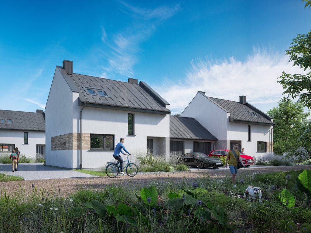 Domy w zabudowie bliźniaczej, połączone są wyłącznie ścianami garażowymi, co daje poczucie intymności dla każdej rodziny.
